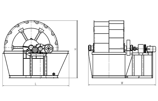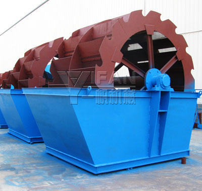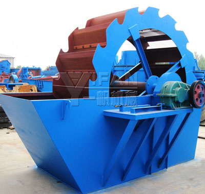 工作時,電機通過三角帶、減速機、齒輪減速后帶動葉輪緩慢轉動,砂石有給料槽進入洗槽中,在葉輪的帶動下翻滾,并互相研磨,除去覆蓋砂石表面的雜質,同時破壞包覆砂粒的水汽層,以利于脫水;同時加水,形成強大水流,及時將雜質及比重小的異物帶走,并從溢出口洗槽排出,完成清洗作用。干凈的砂石由葉片帶走,最后砂石從旋轉的葉輪倒入出料槽,完成砂石的清洗作用。